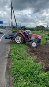 コミュニティ農園、私がトラクターで畑の耕起。メンバーは、田村きのこ園に使い終わった菌床を取りに行ってもらい、戻って納屋で昼食。