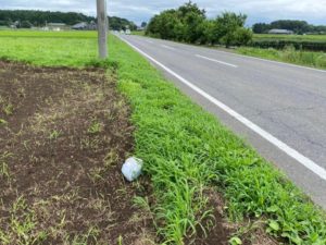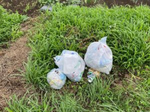 畑に着くと、大きなコンビニのレジ袋で食べたゴミが3つ捨てられていました。道路清掃してきて、違う場所にゴミ!!