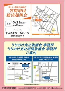うちおけ克之後援会です。 3月22日(日) 午後2時から すみれドリームパークで 新しい笠間市を創る『笠間市民 […]