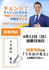 選挙 2026/4/11 (土) New投票用紙には「うちおけ克之」
