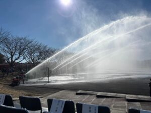 笠間市消防職員、笠間市消防団員が日本ウエルネス高校吹奏楽部による演奏で分列行進。表彰式、そして一斉放水。