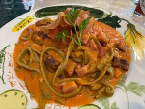 ほうれん草を練り込んだ太麺のパスタを美味しくいただきました。