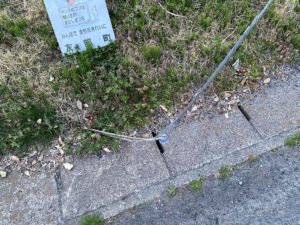 この電柱は防犯灯を設置するために立てられたもので、電柱から斜めに支線が張ってあります。現場を確認するとタイヤで踏んだ跡が。車でバックする際、支線を踏んでしまい、さらにバックして支線を引っ張って電柱が傾いたと思います。