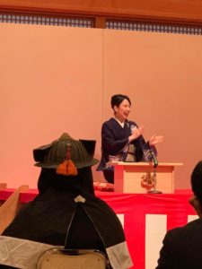笠間義士会では毎年12月14日に、赤穂浪士パレードとそば講(そばを食べながら赤穂浪士の話をする)をしています。今年はパレードと講談講演会を開催予定でしたが、雨でパレードは中止に。しかし、公募の一般市民の方々も赤穂浪士に扮し、写真撮影、一龍斎貞鏡さんの講談を楽しみました。パレードができず残念でしたが、笠間義士会の活動は継続できてよかったです。
