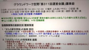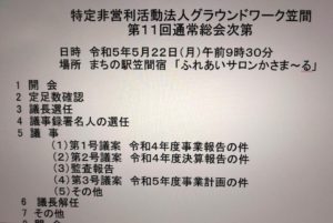内桶顧問(笠間市議副議長)と並木監事にご出席いただき「第11回通常総会」と「第311回運営会議」を開催しました。総会では、第1号議案「令和4年度事業報告」、第2号議案「令和4年度決算報告」、 第3号議案「令和5年度事業計画」 について報告し全員異議なく承認されました。「運営会議」では、久しぶりにご出席いただいた並木監事より明るく楽しい近況報告をしていただきました。会議終了後は、鍋屋の「おにぎり弁当」を食べて散会しました。